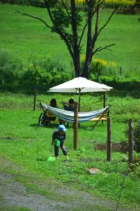 原っぱを駆け回り、虫や蝶を追いかけ、親子で早朝サイクリング、